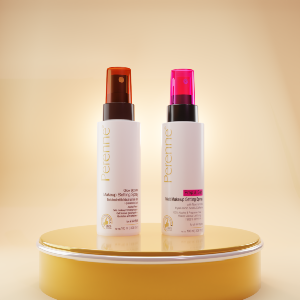 For a radiant, dewy finish, choose Perenne Glow Booster Makeup Setting Spray.